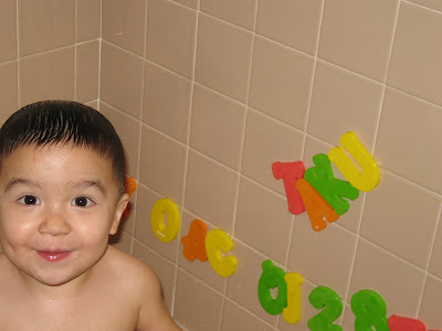 Finally this last gem in our three part installment. My parents bought Taku new foam letters for the bathtub. Being a natural born water bug they have only exacerbated an already untenable situation. The good news is that he can almost spell his name by himself. Too bad he can't differentiate the pronunciation of a "Q" (pronounced Quuuuu) and a "U" (also pronounced Quuuuu).